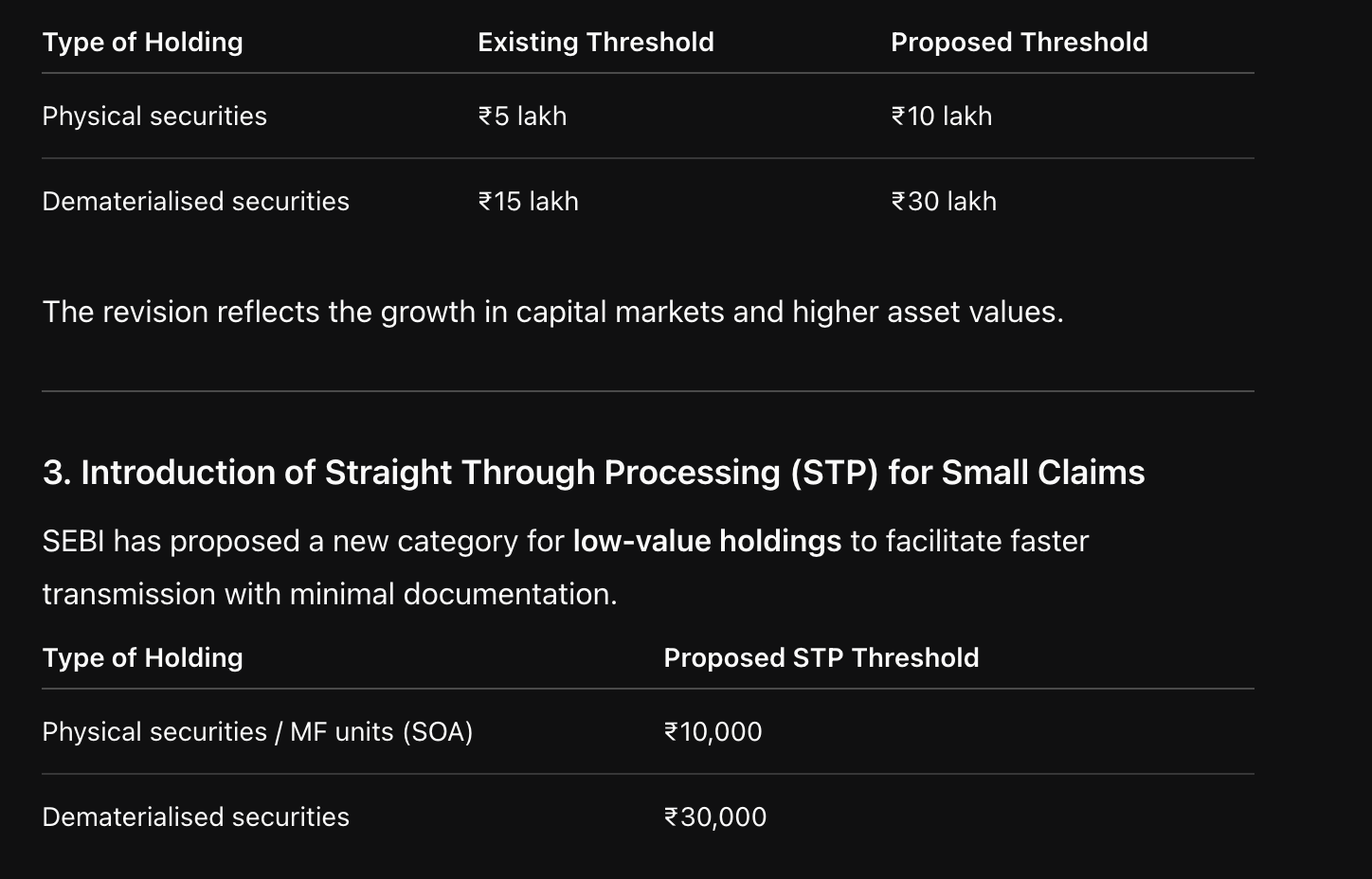The objective of the proposal is to reduce documentation complexities, improve ease of settlement for investors’ families, and bring uniformity in procedures followed by listed companies, registrars and transfer agents (RTAs), depositories, depository participants (DPs), and asset management companies (AMCs).